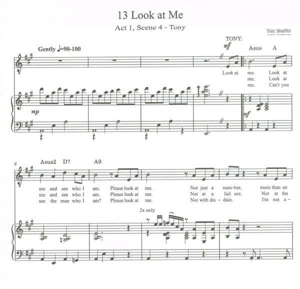 From the musical comedy Where There's a Will by Tim Shaffer, with Dustin Oliver. "Look at Me" is sung by Tony, an inmate who wants someone (perhaps someone in particular) to look past the worst thing he has ever done and see him as he really is.
